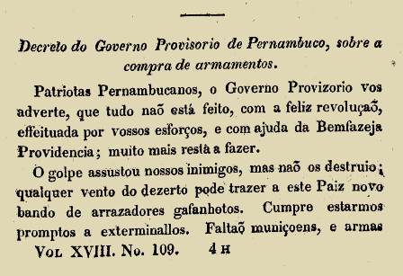 Em Pernambuco, muitos se posicionaram contrários à manutenção dos vínculos com a Metrópole. O resultado? O movimento iniciado em março de 1817. As primeiras notícias da revolução assim como as repercussões na Paraíba, Rio Grande do Norte e Ceará seriam divulgadas pelo Correio Braziliense em maio, na edição de número 108. Na tiragem seguinte, com mais informações, o jornal ampliou o noticiário. Reproduziu manifestos e decretos do Governo Provisório, além de publicar documentos e discursos proferidos pelos revolucionários que almejavam livrar a região das “garras do despotismo que asfixiava as esperanças”.
