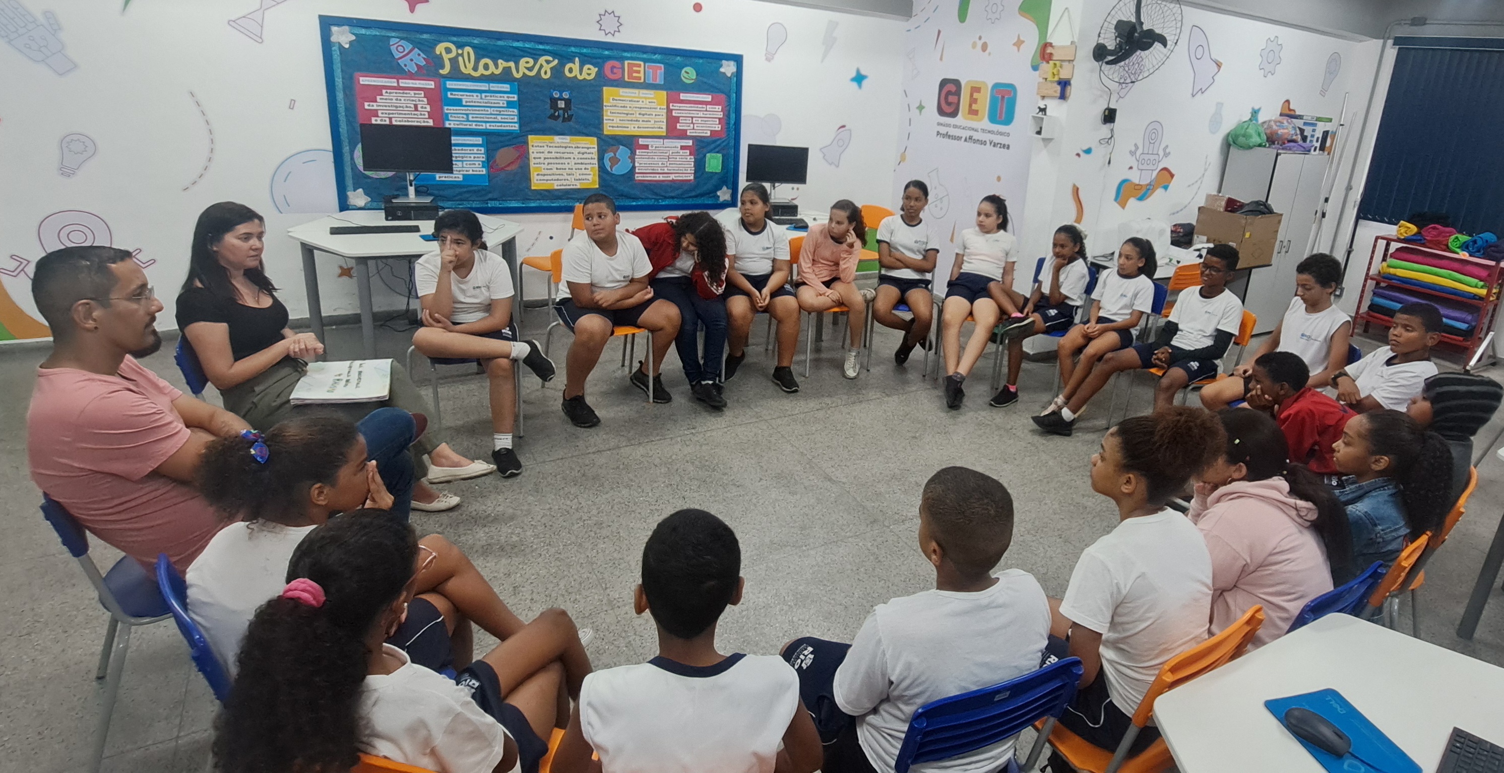 No espaço do Colaboratório do GET Prof. Affonso Varzea, os alunos foram convidados a se sentarem em círculo para assistir ao vídeo “Formação do povo brasileiro” (5:39min), depois uma roda de conversa foi iniciada sobre miscigenação e diversidade étnica e cultural. Num segundo momento, os alunos assistiram ao vídeo “Ninguém nasce racista” (3:41 min) e tiveram acesso a algumas reportagens sobre racismo. Numa prática de debate, expressaram opinião sobre atitudes e posturas inadequadas, bem como distinguiram fato de opinião. Falamos sobre algumas causas e consequências do racismo. Relatos de situações análogas ao material estudado surgiram, levando-os a perceber a complexidade do cenário em que vivemos, em particular o bullying racial praticado por alguns alunos; os caminhos de resistência e luta, e especialmente, a importância de trabalharmos com seriedade e respeito a temática do racismo.