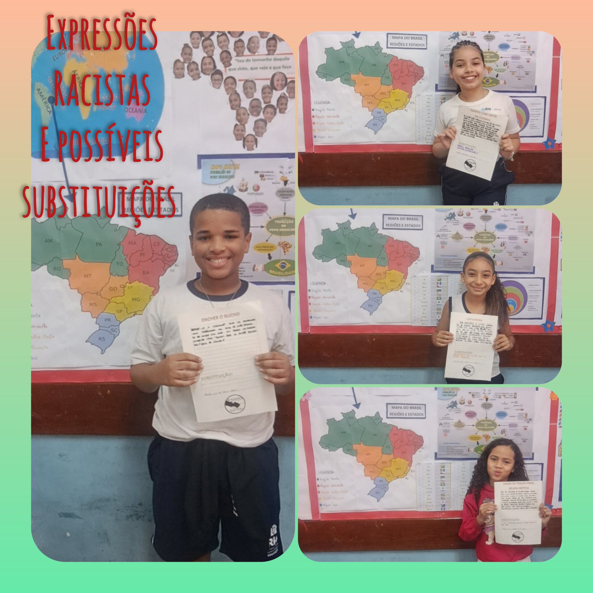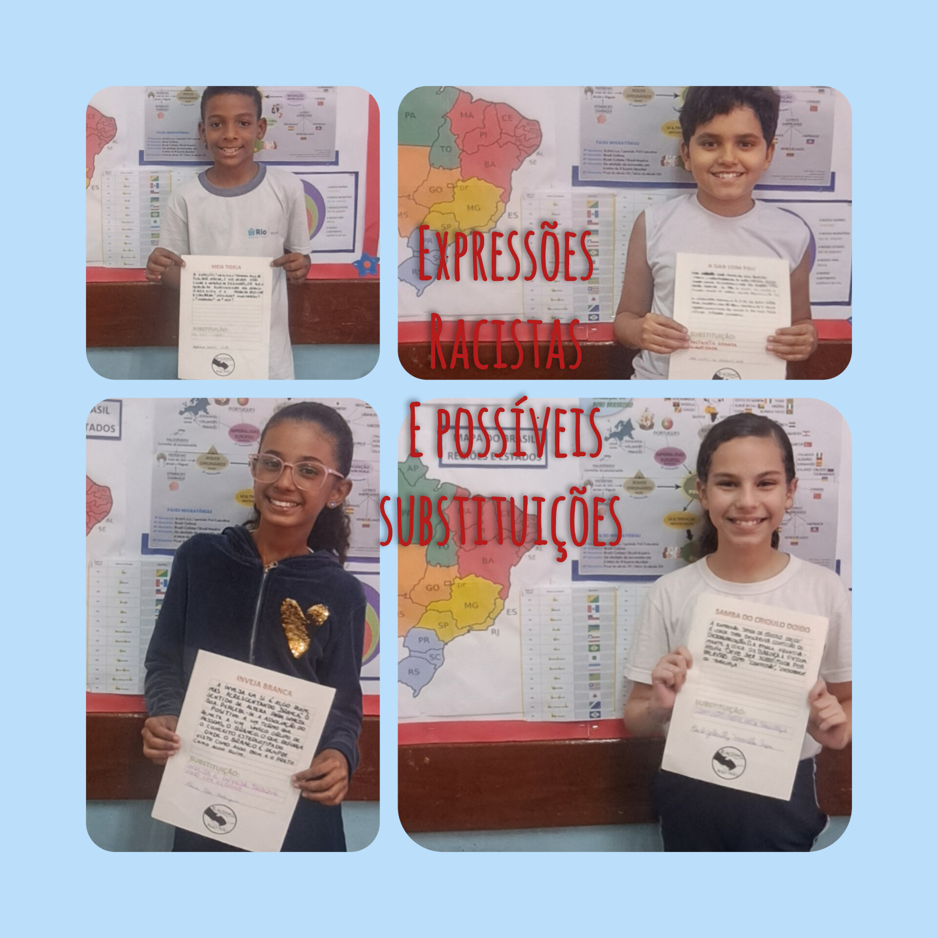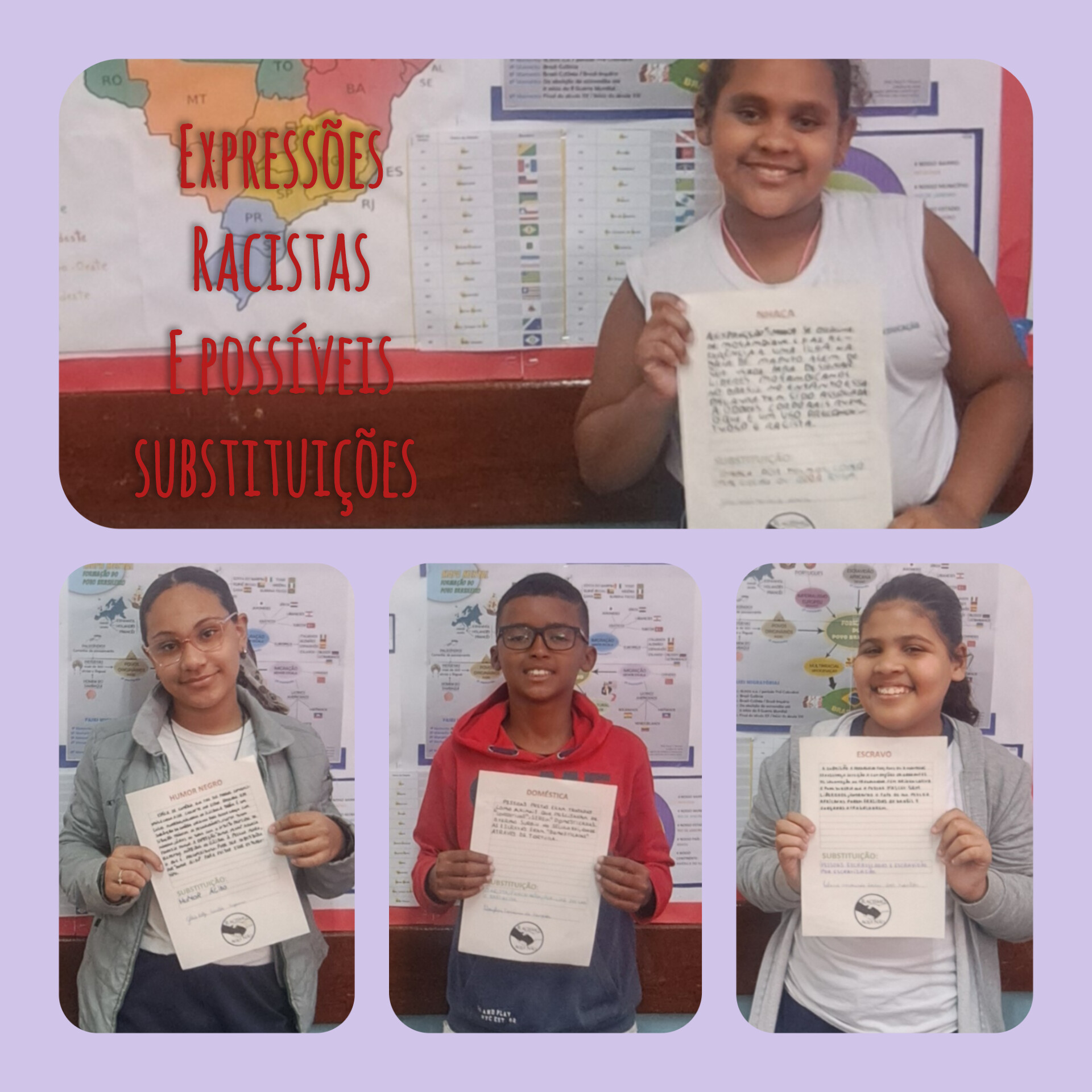 A proposta pedagógica de construção do painel/livro "Expressões Racistas e Possíveis Substituições" apresentou a cada aluno uma expressão de cunho racista, que teve o desafio de realizar a pesquisa (em pelo menos 3 sites diferentes) sobre o sentido da expressão, o porquê de ser considerada racista; bem como buscar um outro termo para substituir o uso dessa expressão. Após a pesquisa, os alunos escreveram suas descobertas em folhas de papel A4 padronizadas e compartilharam oralmente para seus colegas de turma, numa roda de debates bastante enriquecedora. Inicialmente, essas páginas foram expostas num painel de expressões racistas e substituições; mas posteriormente, transformaram-se nas páginas do primeiro livro de autoria da turma. A partir deste trabalho já foi possível notar uma mudança significativa nas atitudes de alguns alunos, que até então praticavam bullying racial, assim como uma crescente consciência sobre o que é racismo e como combatê-lo. Muitos alunos ficaram surpresos ao perceberem que algumas expressões conhecidas por eles tinham conotação racista e manifestaram satisfação em aprender termos não racistas, contribuindo assim para o uso de uma comunicação mais adequada nas suas relações interpessoais, que podem impactar inclusive familiares, vizinhos e outros amigos. Se o primeiro semestre do ano letivo foi marcado com inúmeras atitudes de agressões verbais e físicas; apos este trabalho, especialmente, já não vivenciamos mais estes cenários. E isso só foi possível porque os alunos que antes carregavam sentimentos de exclusão foram valorizados e incluídos.