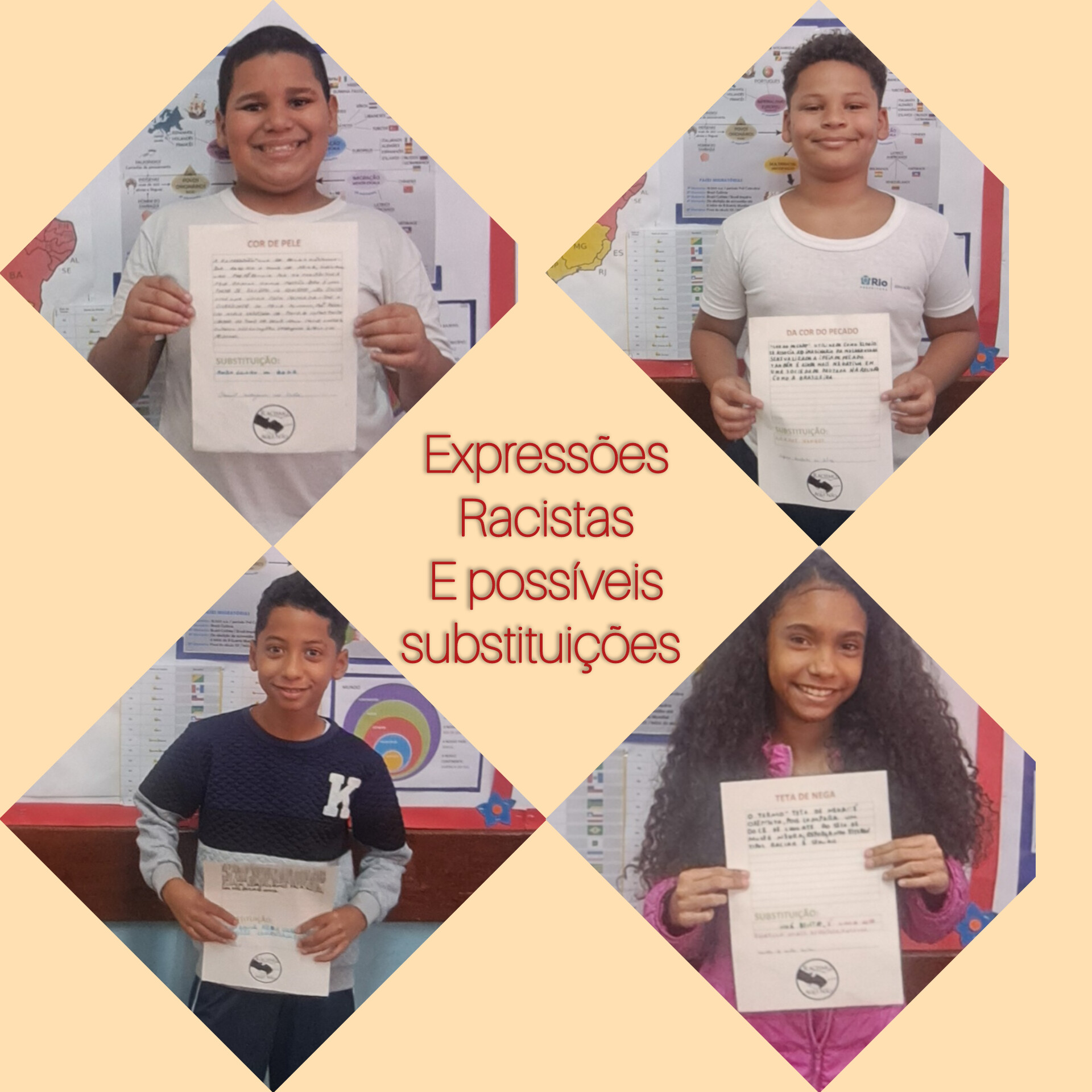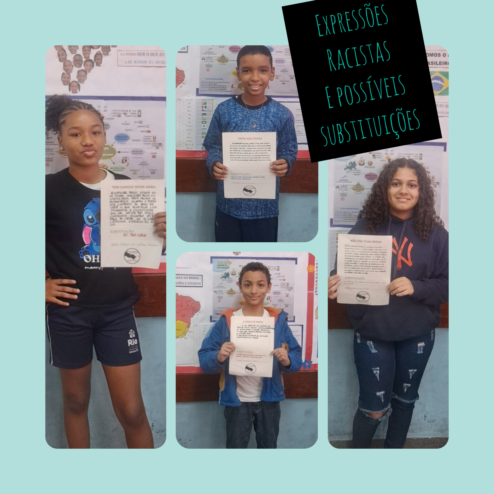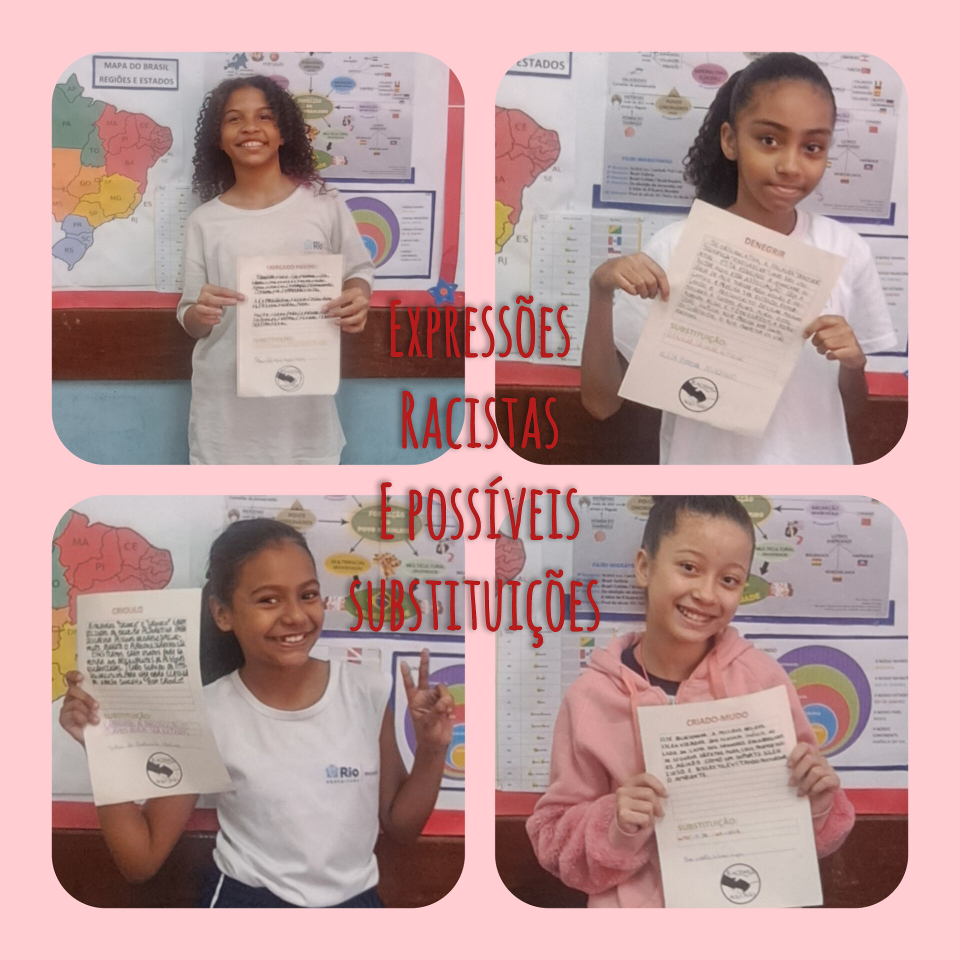 A proposta pedagógica de construção do painel/livro "Expressões Racistas e Possíveis Substituições" apresentou a cada aluno uma expressão de cunho racista, que teve o desafio de realizar a pesquisa (em pelo menos 3 sites diferentes) sobre o sentido da expressão, o porquê de ser considerada racista; bem como buscar um outro termo para substituir o uso dessa expressão. Após a pesquisa, os alunos escreveram suas descobertas em folhas de papel A4 padronizadas e compartilharam oralmente para seus colegas de turma, numa roda de debates bastante enriquecedora. Inicialmente, essas páginas foram expostas num painel de expressões racistas e substituições; mas posteriormente, transformaram-se nas páginas do primeiro livro de autoria da turma. A partir deste trabalho já foi possível notar uma mudança significativa nas atitudes de alguns alunos, que até então praticavam bullying racial, assim como uma crescente consciência sobre o que é racismo e como combatê-lo. Muitos alunos ficaram surpresos ao perceberem que algumas expressões conhecidas por eles tinham conotação racista e manifestaram satisfação em aprender termos não racistas, contribuindo assim para o uso de uma comunicação mais adequada nas suas relações interpessoais, que podem impactar inclusive familiares, vizinhos e outros amigos. Se o primeiro semestre do ano letivo foi marcado com inúmeras atitudes de agressões verbais e físicas; apos este trabalho, especialmente, já não vivenciamos mais estes cenários. E isso só foi possível porque os alunos que antes carregavam sentimentos de exclusão foram valorizados e incluídos.