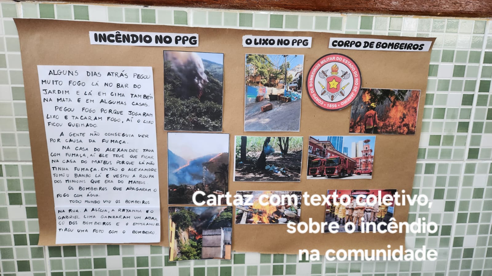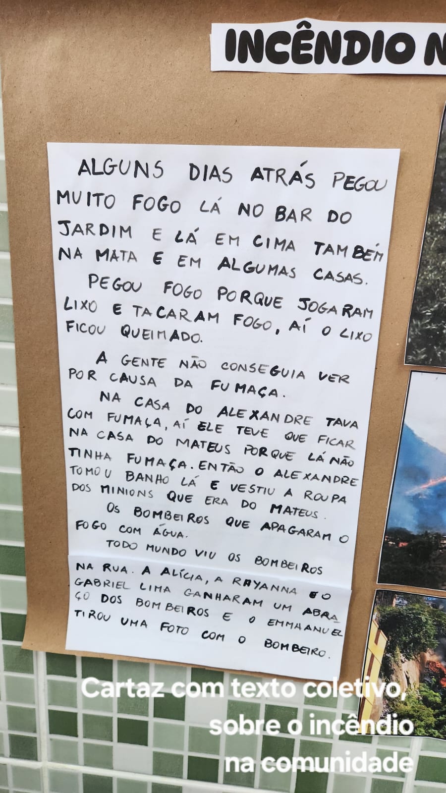 Painel com texto coletivo e imagens referentes ao incêndio ocorrido na comunidade em agosto de 2024.
