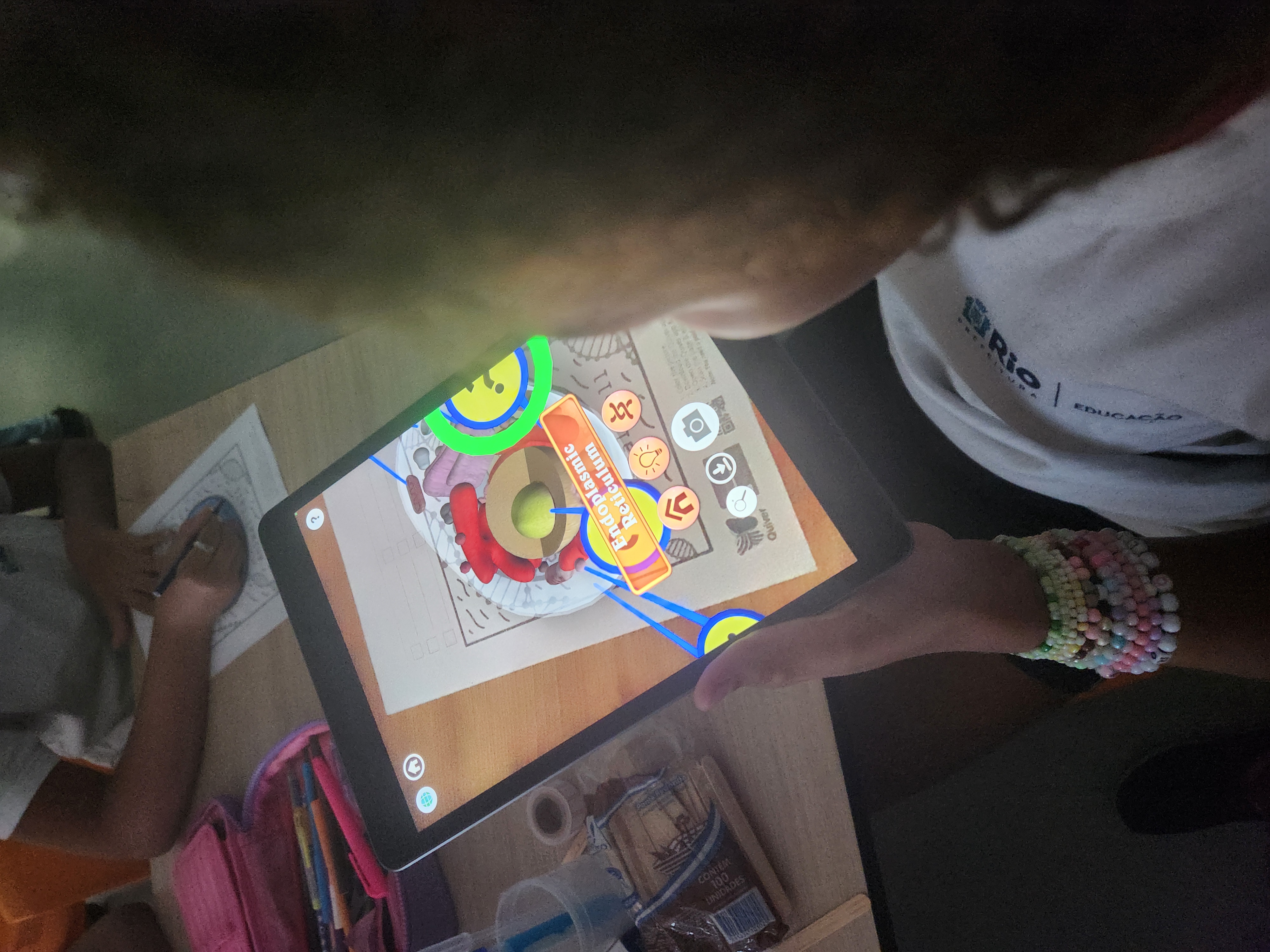 Em seguida, a mágica aconteceu: Os estudantes pintaram uma figura, apontaram seus tablets e com a realidade aumentada viram as células "ganharem vida" no colaboratório. Núcleo, citoplasma, membrana... Tudo em 3D e interativo! Era como se as células estivessem flutuando na frente deles, prontas para serem exploradas com um toque.