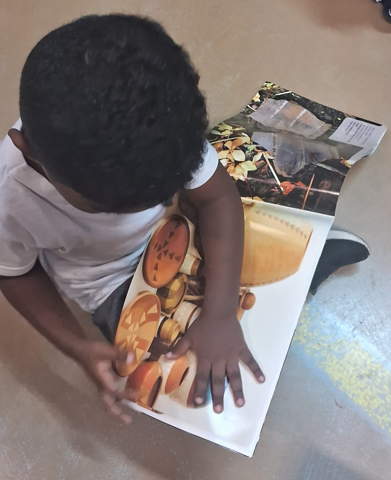 Foram organizados momentos em que as crianças interagiram com os instrumentos musicais da Caixa Étnico-Racial, como pau-de-chuva, tambores e berimbaus, promovendo vivências sonoras que dialogavam com as culturas apresentadas, aguçando suas expressões artísticas e musicais.