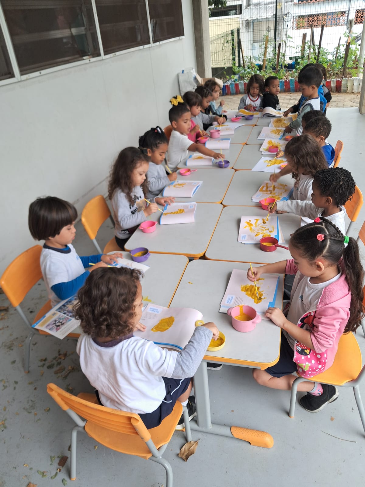 As crianças aprenderam sobre pigmentações naturais e quais materiais poderiam ser utilizados para criar tintas, como carvão, argila e cúrcuma. Elas também produziram suas próprias tintas naturais, utilizando açafrão, e realizaram pinturas livres com elas.