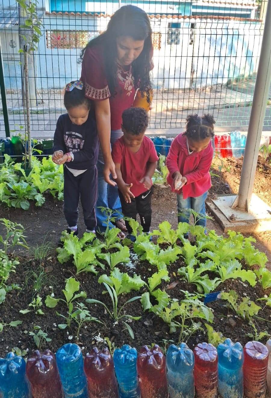 Foi realizado o cultivo de alguns alimentos na horta da escola, construída com a participação das famílias, com o intuito de apresentar às crianças os processos de plantio. Isso proporcionou vivências próximas à natureza, aprendendo também a respeitá-la. As crianças tinham a possibilidade de mexer na terra e brincar com sementes, folhas e outros elementos encontrados na área externa da escola.