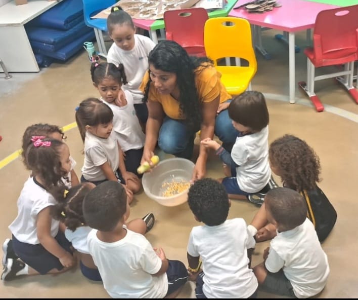 Apresentei aos meus alunos as transformações de alimentos, como o milho que foi transformado em pipoca, e também a batata-doce, a macaxeira e a tapioca, que puderam degustar.