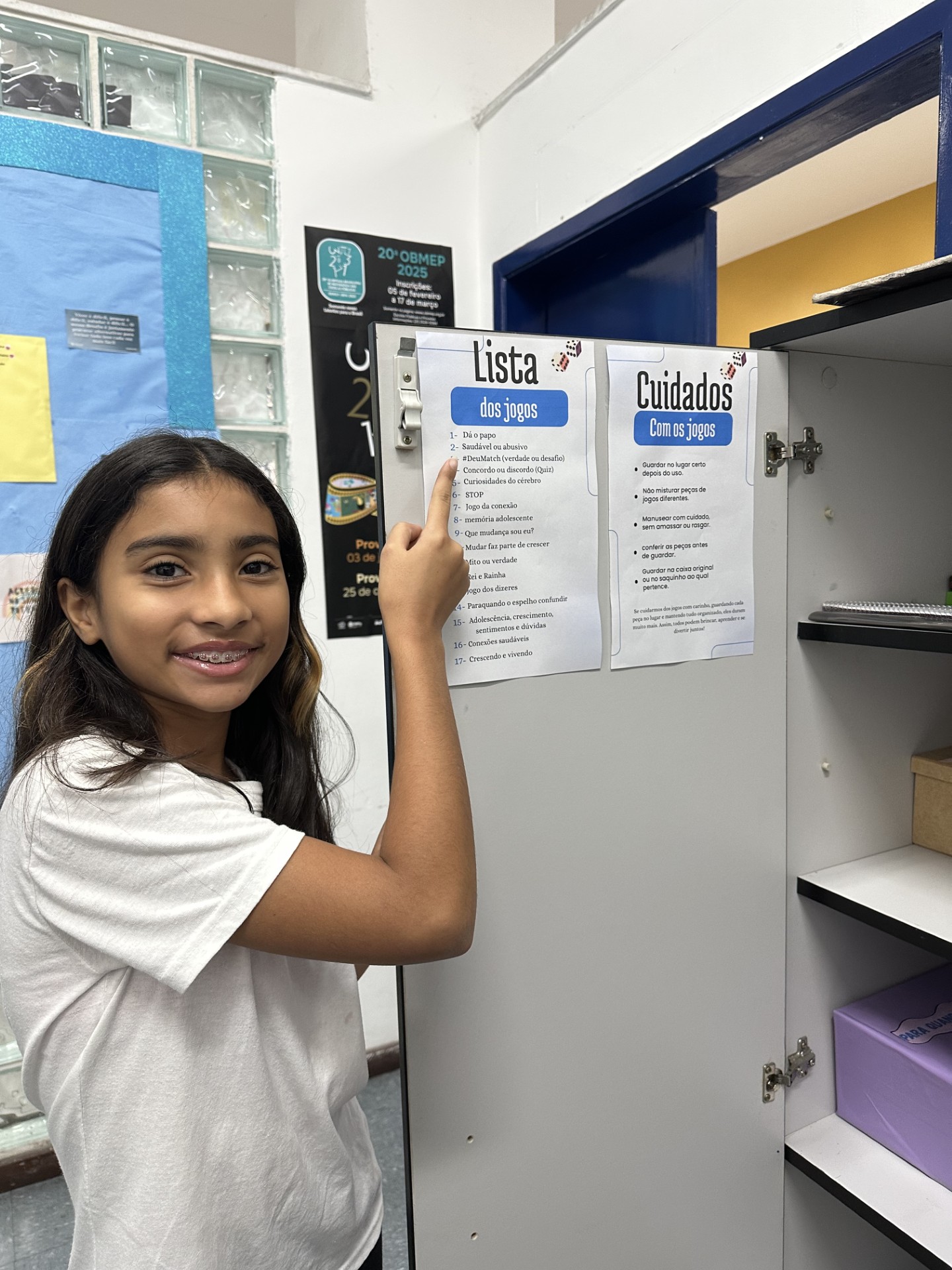 Todos os jogos estão numerados e organizados em uma listagem, o que facilita a conferência e garante que o material esteja sempre disponível para todos. Além disso, o armário conta com orientações importantes sobre o cuidado e preservação dos jogos, reforçando a responsabilidade coletiva pelo uso desse bem comum.