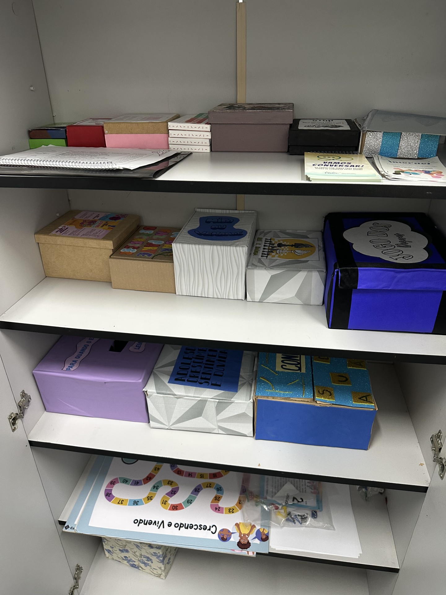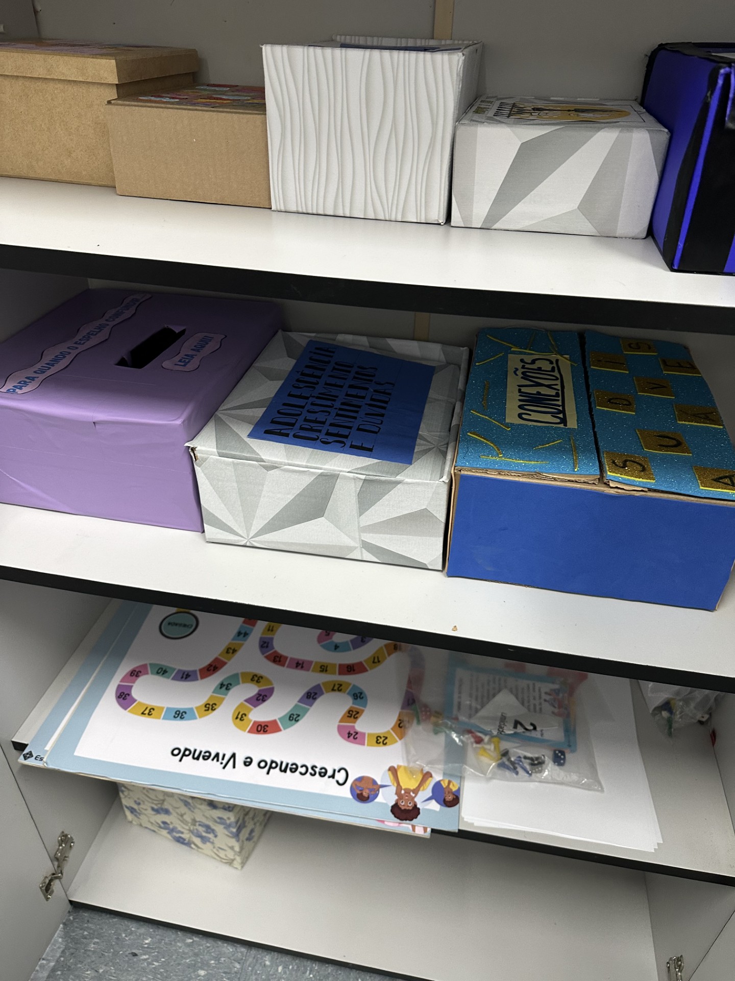 Os jogos que fazem parte desse armário foram criados pelos estudantes de Medicina da Estácio – IDOMED , em uma parceria com a nossa escola. São jogos educativos que abordam temas como autocuidado, saúde, bem-estar, higiene e saúde mental.