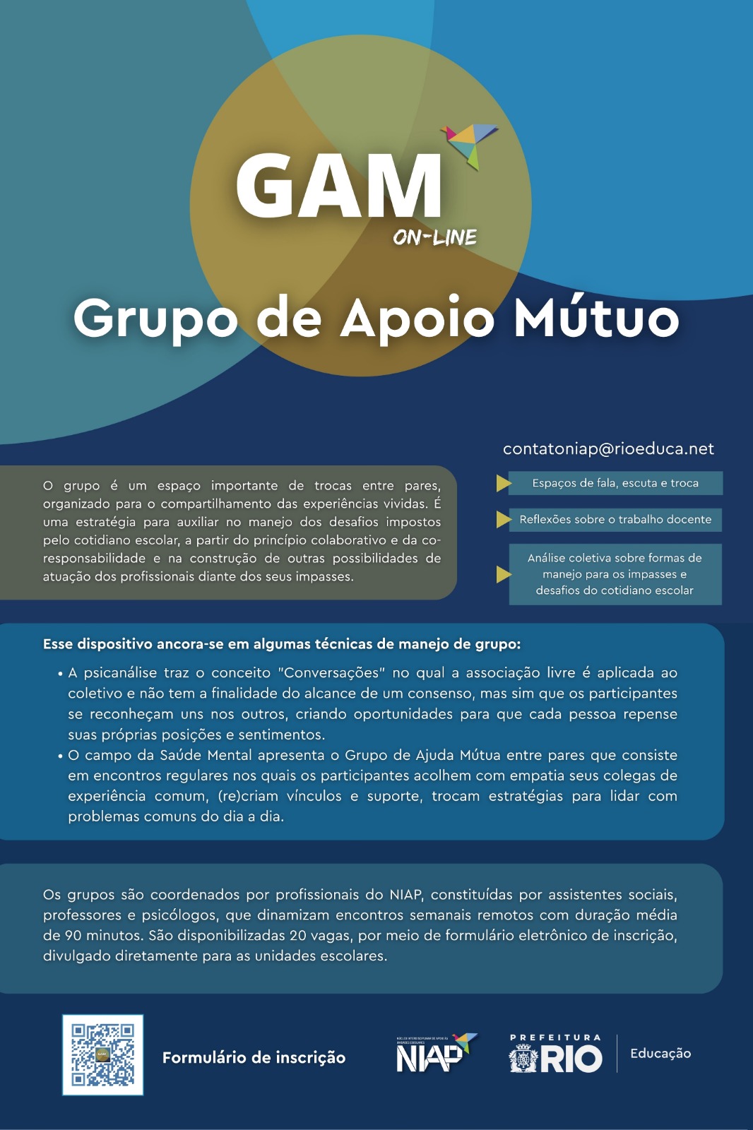 O "Grupo de Apoio Mútuo (GAM) on-line para Profissionais de Educação" é um espaço para trocas entre pares, organizado para o compartilhamento das experiências vividas no cotidiano escolar. É uma estratégia para auxiliar no manejo dos desafios impostos na escola, a partir de princípios colaborativos e de corresponsabilidade.