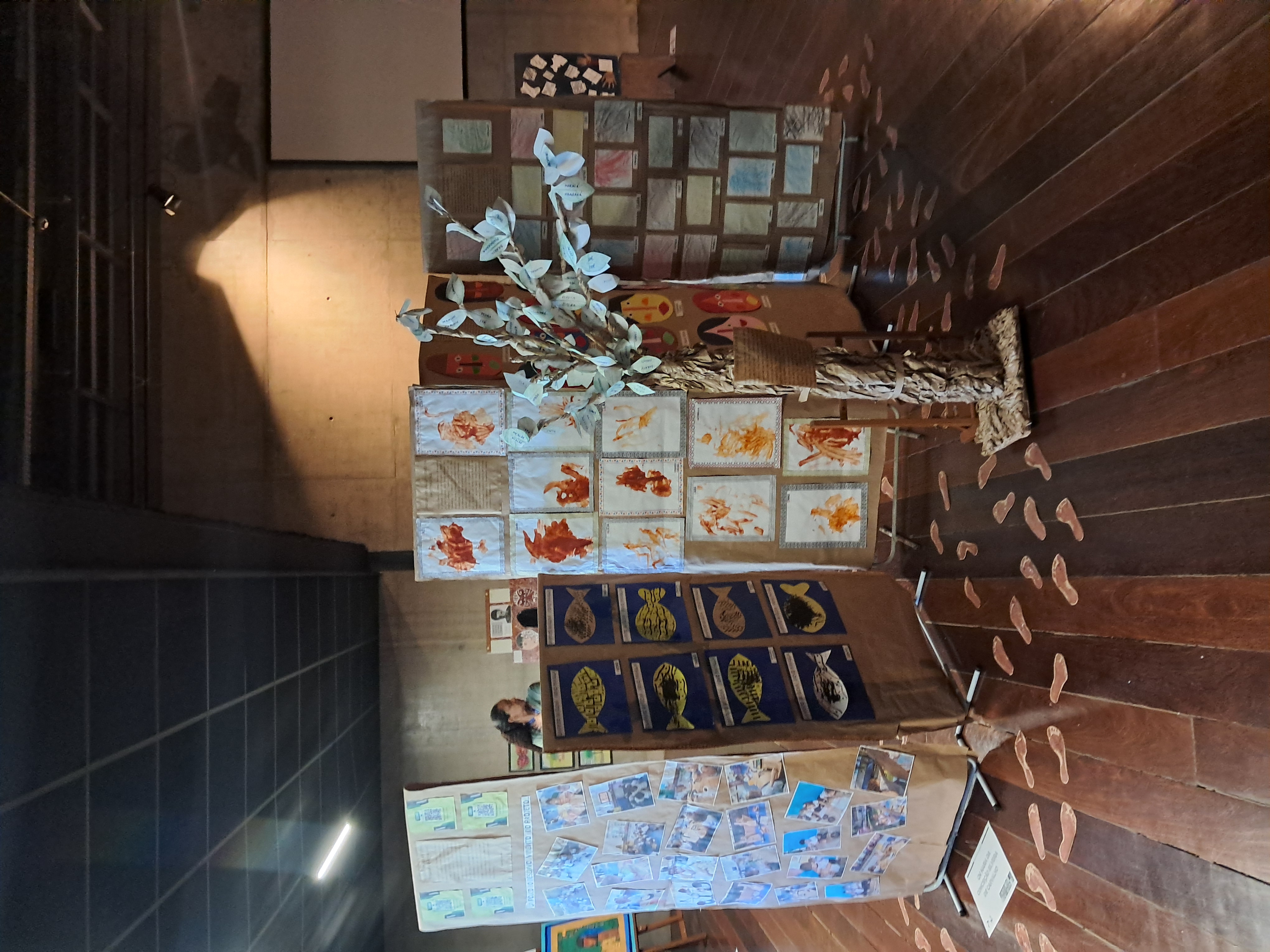 Para a exposição, construíram uma Árvore de Palavras em papelão e kraft, simbolizando raízes culturais e mostrando palavras em tupi-guarani aprendidas durante o projeto. Uma trilha formada por carimbos dos pés das crianças convidava o público a “caminhar” pela cultura indígena. Ao fundo, um áudio reproduzia as crianças falando palavras em tupi, fortalecendo o vínculo entre oralidade, memória e ancestralidade.