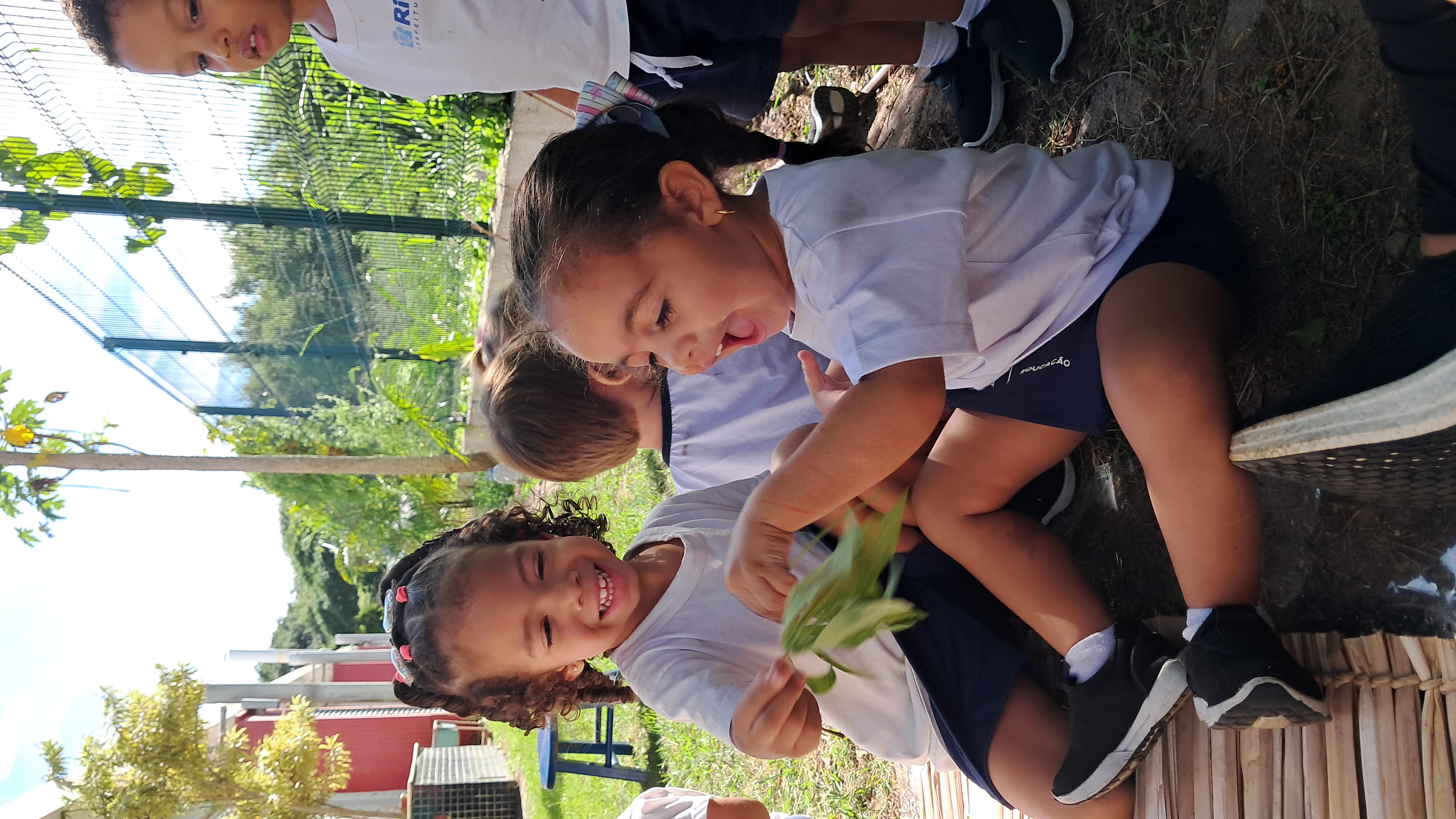 As educadoras criaram um espaço na horta para investigar a mandioca, alimento tradicional dos povos indígenas e parte do cardápio escolar. As crianças ouviram a história Menina Mandioca, assistiram ao curta da lenda de Mani e exploraram a mandioca pelos sentidos, vivenciando experiências sensoriais e lúdicas.