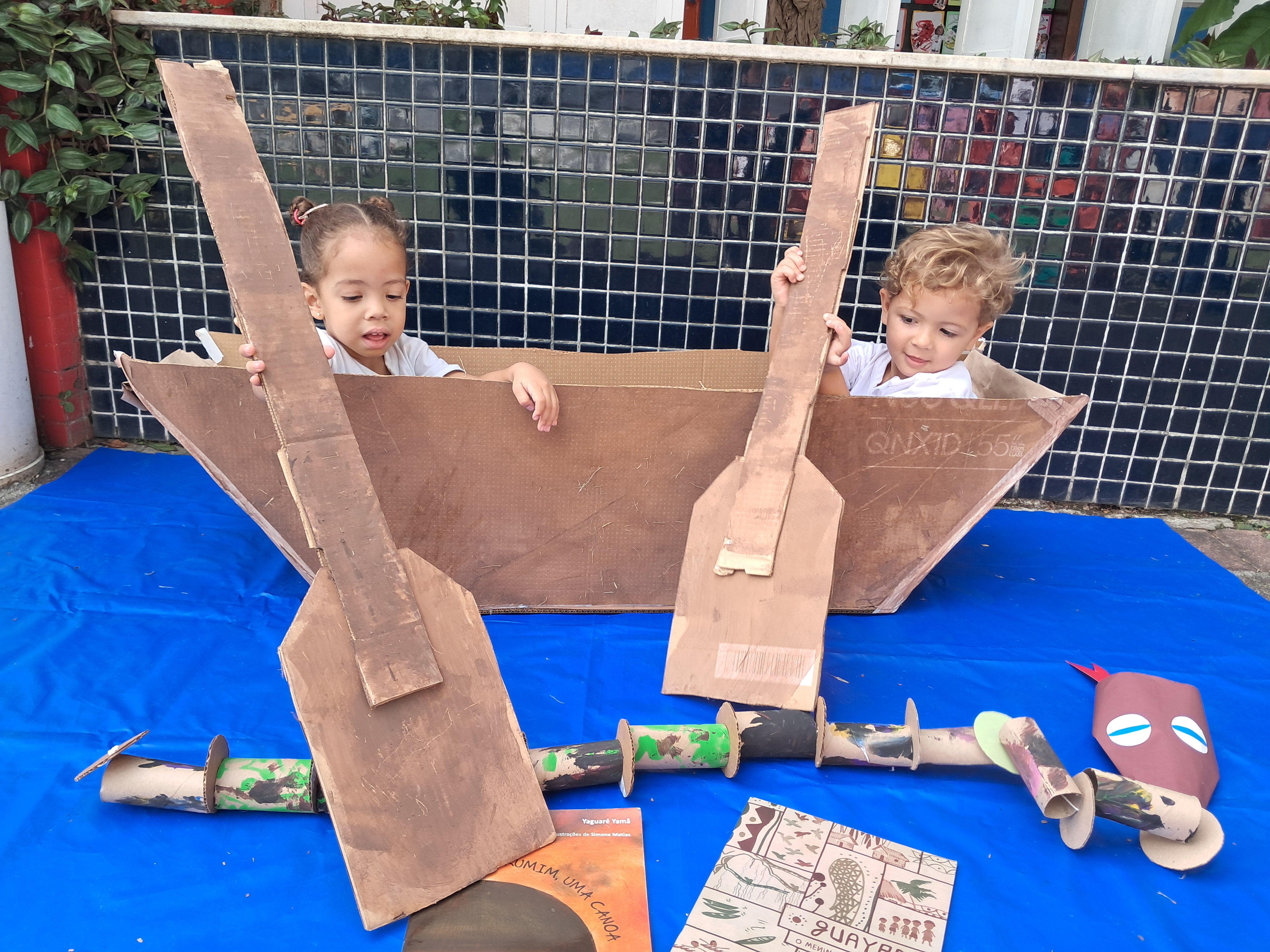 Produziram um peixe com grafismos Maraguá usando carimbos, pintaram uma canoa com remos de papelão e construíram uma cobra grande com rolos de papel, tinta e barbante, brincando simbolicamente de navegar como o curumim das histórias. Também exploraram palavras cotidianas em tupi-guarani, pronunciando-as à sua maneira.