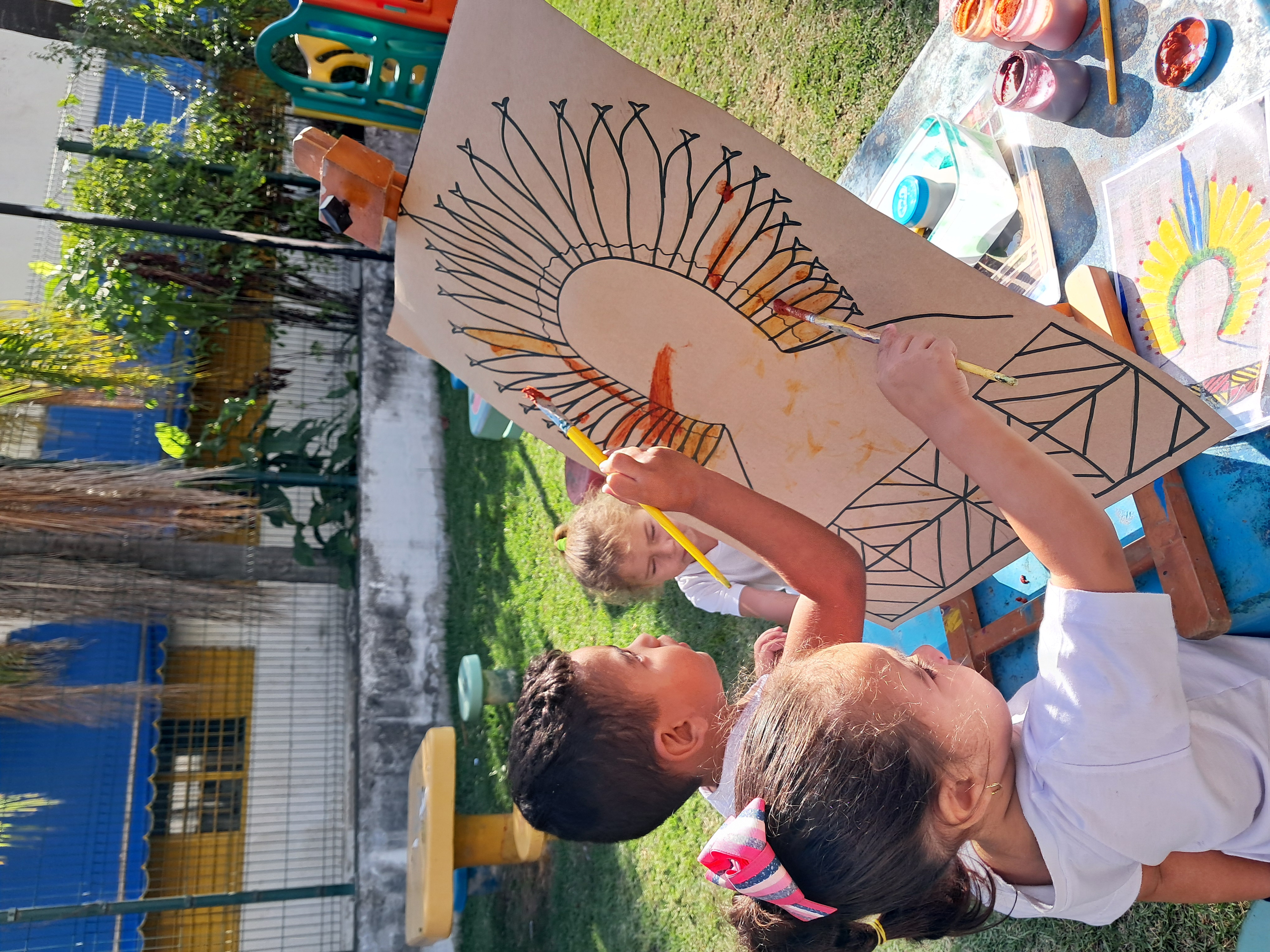 Inspiradas na arte de @frankbentesartes, do povo Maraguá, as crianças realizaram uma pintura coletiva sobre papel cartão. O trabalho em grupo reforçou valores de coletividade presentes nas culturas indígenas e mostrou que a arte indígena é contemporânea, plural e carregada de saberes.