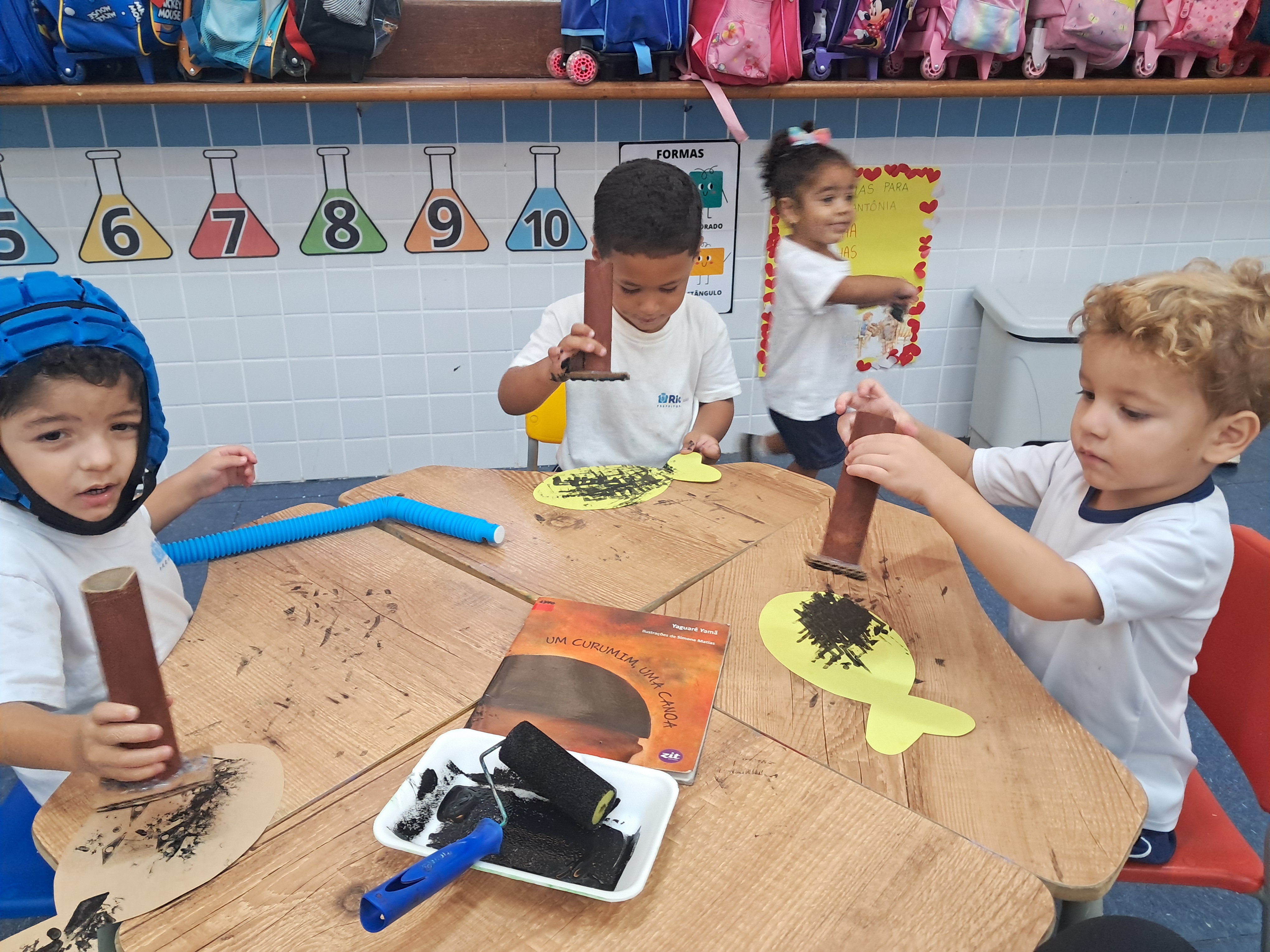As crianças iniciaram o projeto aprendendo palavras de origem tupi a partir do livro Falando Tupi, de Yaguarê Yamã, e conhecendo aspectos da vida e dos costumes do povo Maraguá por meio das obras Guayarê: o menino da aldeia do rio e Um curumim, uma canoa. Vivenciaram experiências com o maracá, exploraram materiais naturais no espaço externo e participaram do circuito simbólico “Caminhos da Floresta”, equilibrando-se em troncos, saltando obstáculos e “atravessando” a lama em aventuras imaginadas.