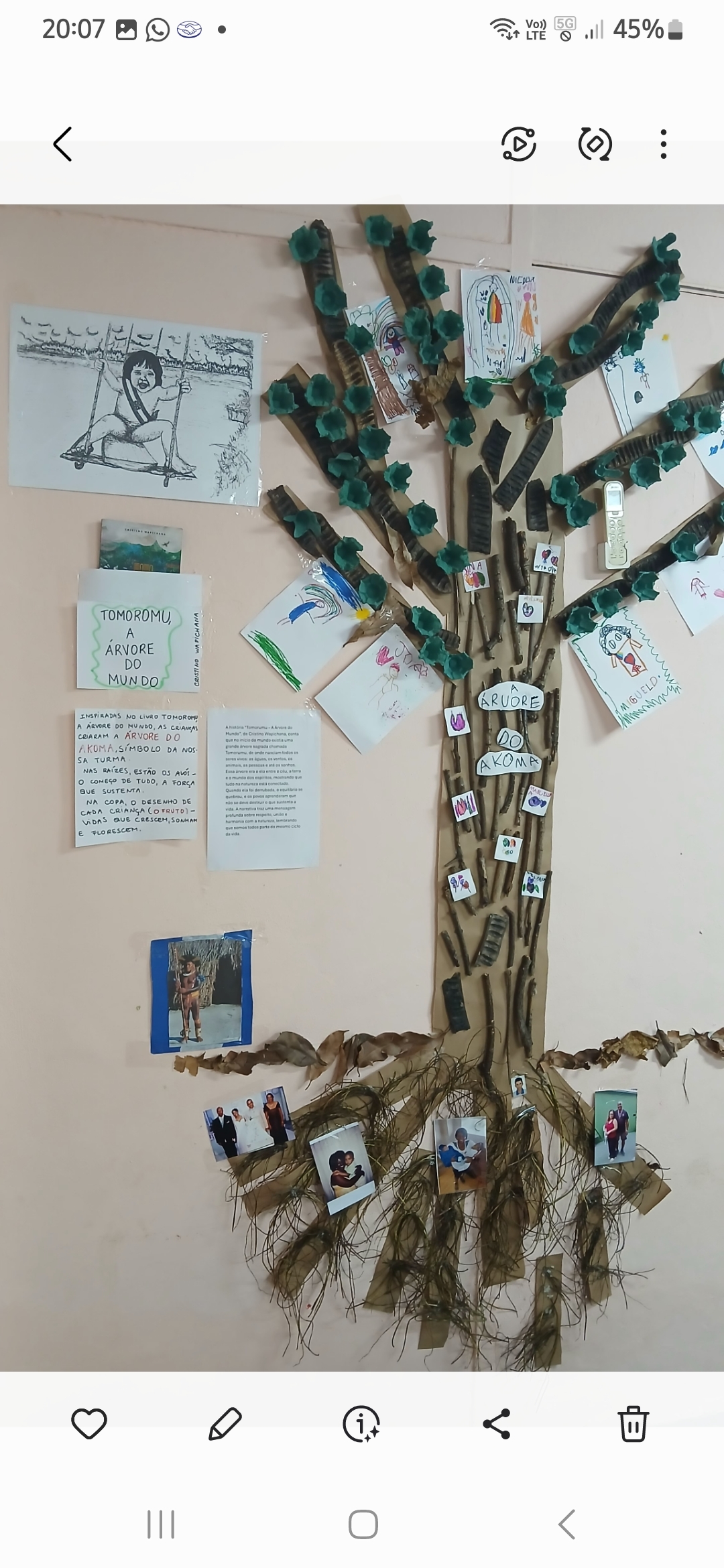 As famílias enviaram fotos de seus ancestrais, que foram colocadas nas raízes da nossa árvore Tomorumu. As crianças se desenharam e formaram a copa, simbolizando os frutos que crescem através do cuidado e do respeito aos mais velhos. A árvore construída com galhos recolhidos no quintal representou a união entre natureza, identidade e história. As crianças decidiram nomeá-la “Árvore do Akoma”, fortalecendo vínculo e pertencimento.