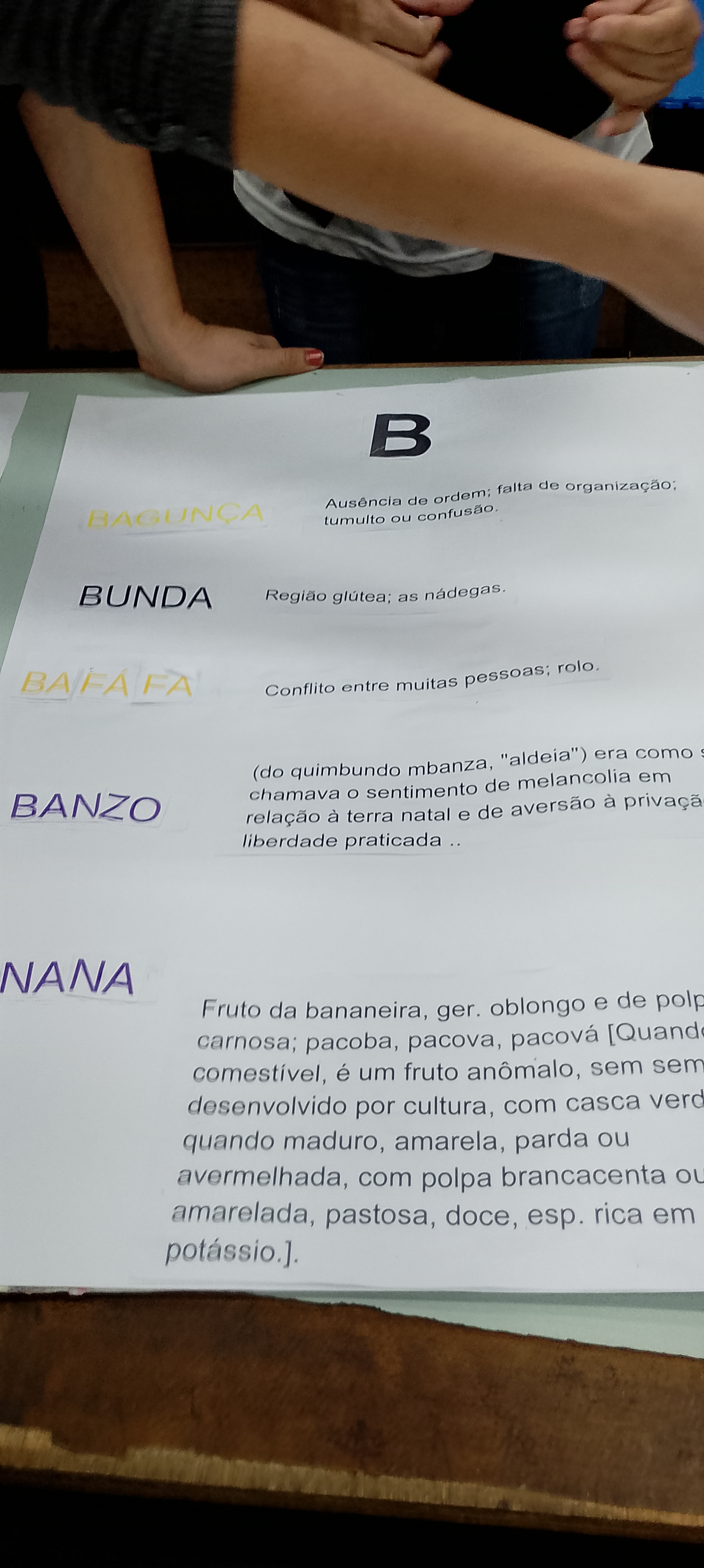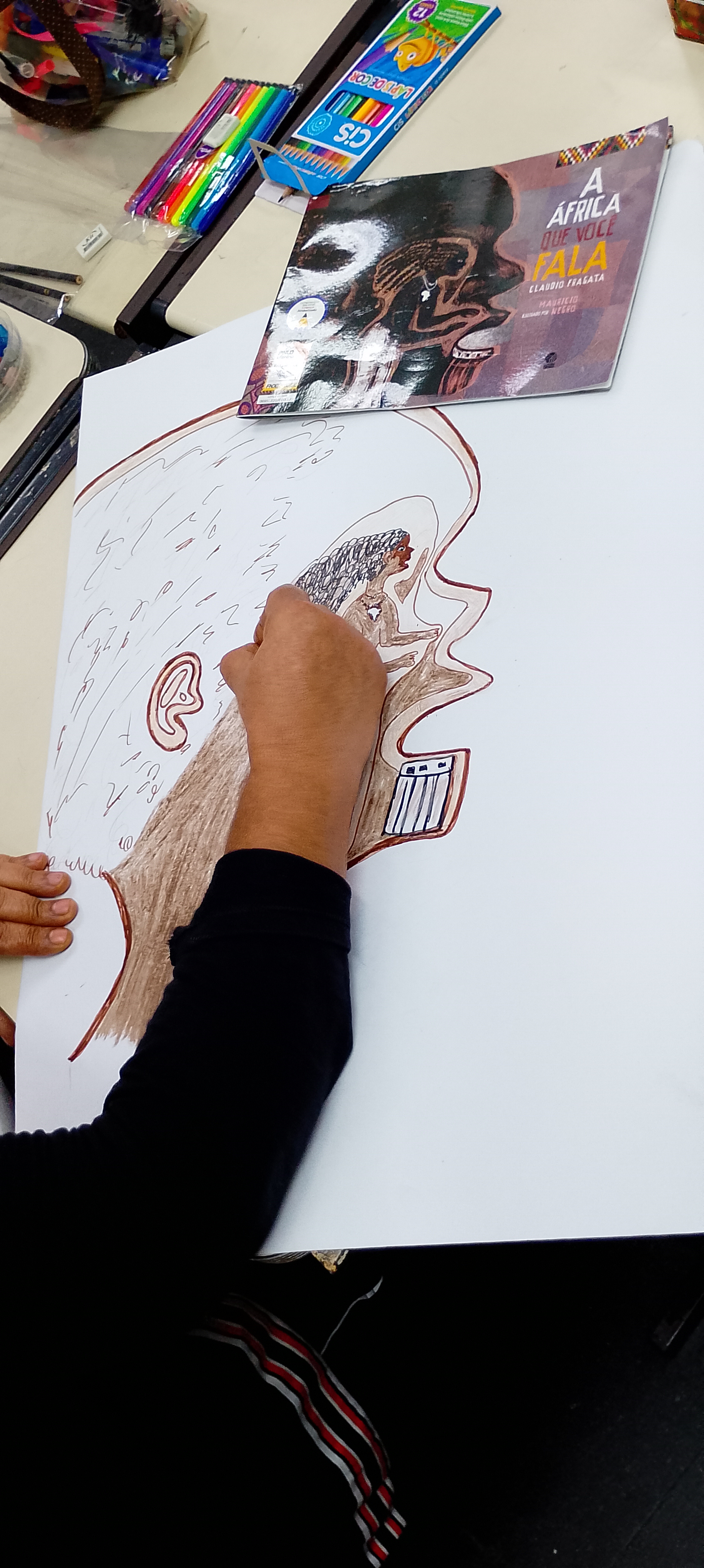 Durante as aulas, os alunos foram convidados a refletir sobre a ancestralidade e a influência africana em sua linguagem, suas práticas culturais e em sua própria identidade. A primeira aula, “Palavras que carregam ancestralidade”, despertou grande curiosidade. A roda de conversa revelou que muitos alunos reconheciam termos como axé, samba e cafuné, mas desconheciam sua origem africana. A leitura do livro A África que você fala (Cláudio Fragata) e a criação do “Dicionário Africano” possibilitaram uma rica troca de saberes e o reconhecimento de que a língua portuguesa falada no Brasil carrega marcas profundas da cultura africana.