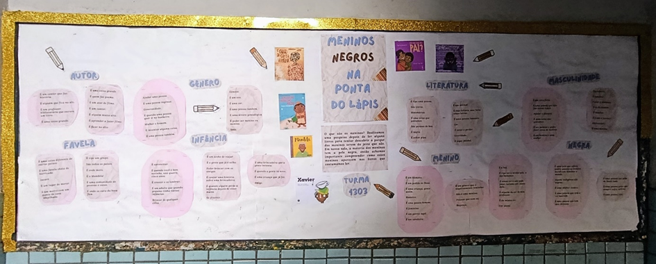 Ficou evidente que a atividade não teria como desmontar questões tão estruturantes de nossas relações de gênero. Contudo, levar essa discussão para a sala foi importante para que os meninos entendessem que o ser masculino também é uma forma entender o mundo. A criação de aforismas para o mural foi bem importante pois nos permitiu ver a produção de conhecimentos das crianças a partir desse tópico. É visível na multiplicidade de interpretação de palavras como: autor, favela, gênero, infância, literatura, masculinidade, menino, e negra, como as crianças tem visões potentes.