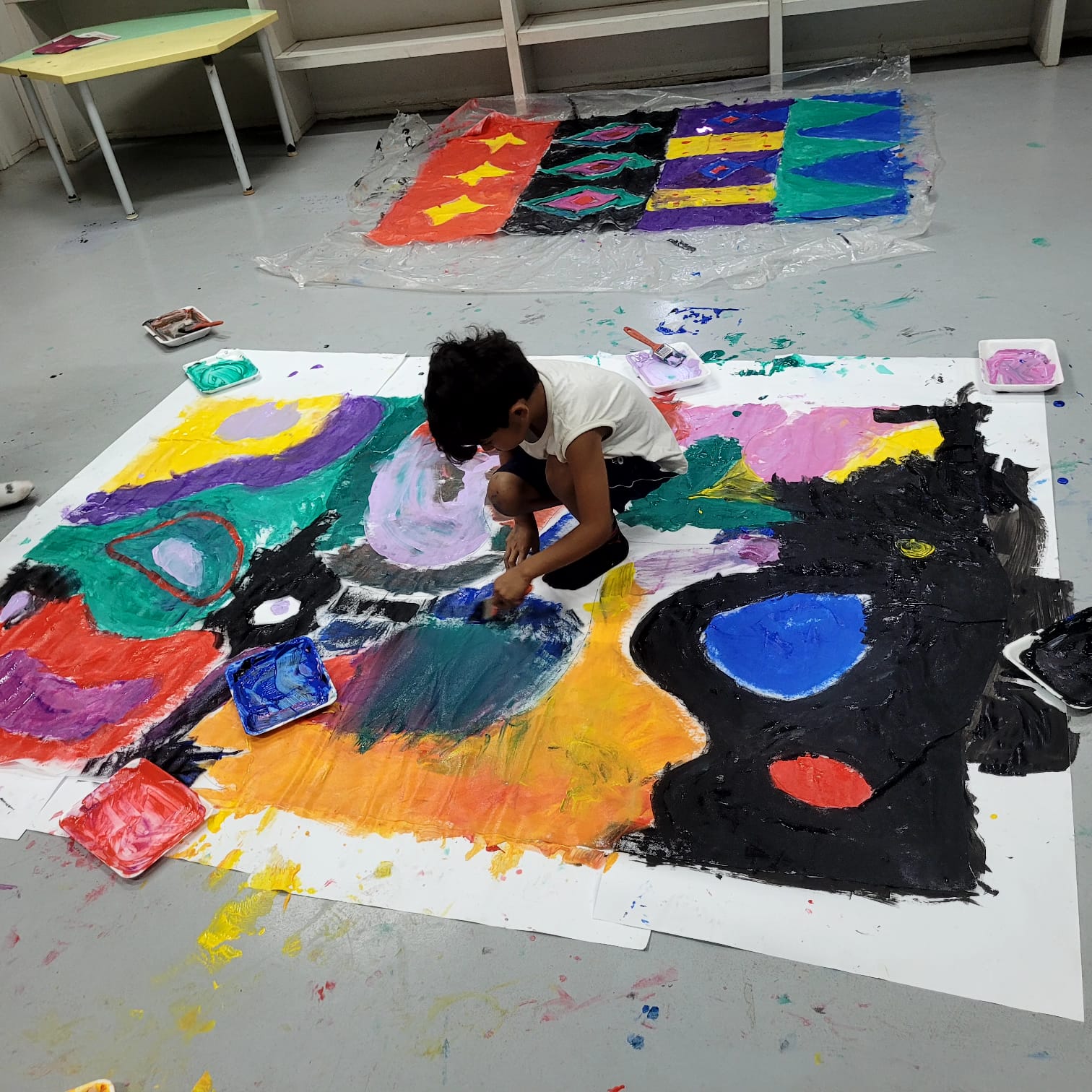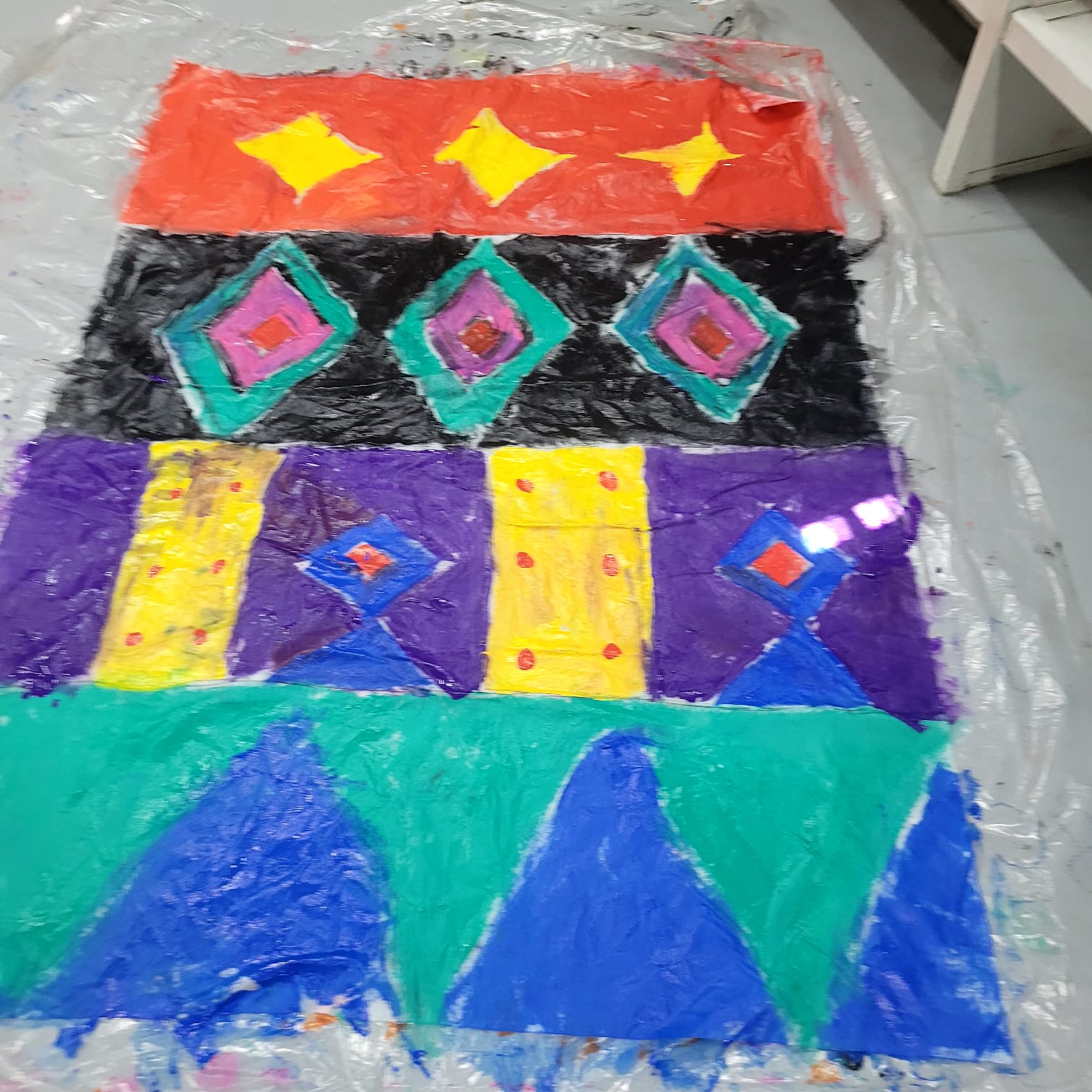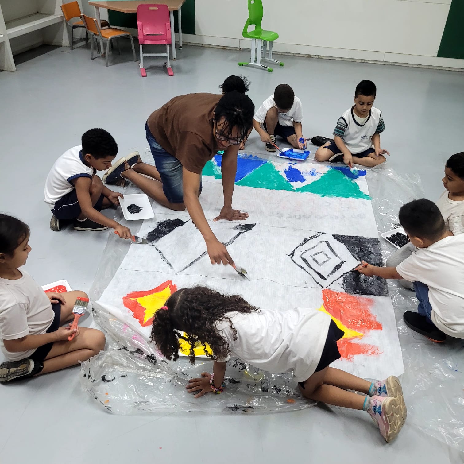 Na sequência, as crianças exploraram os símbolos Adinkra de Gana, confeccionando carimbos e pulseiras com miçangas, associando forma, cor e significado. As danças africanas em roda ampliaram a expressão corporal e a escuta rítmica, reforçando o trabalho coletivo e o respeito às diferenças.