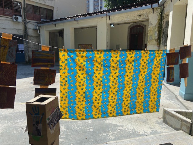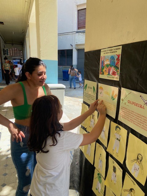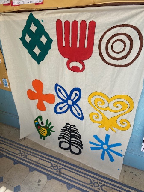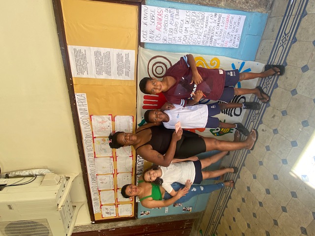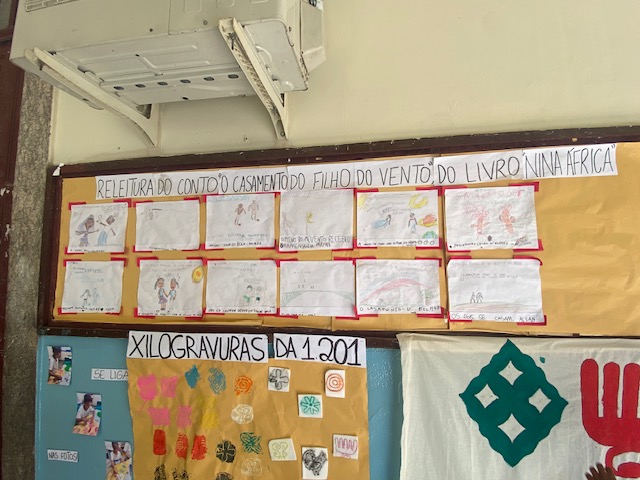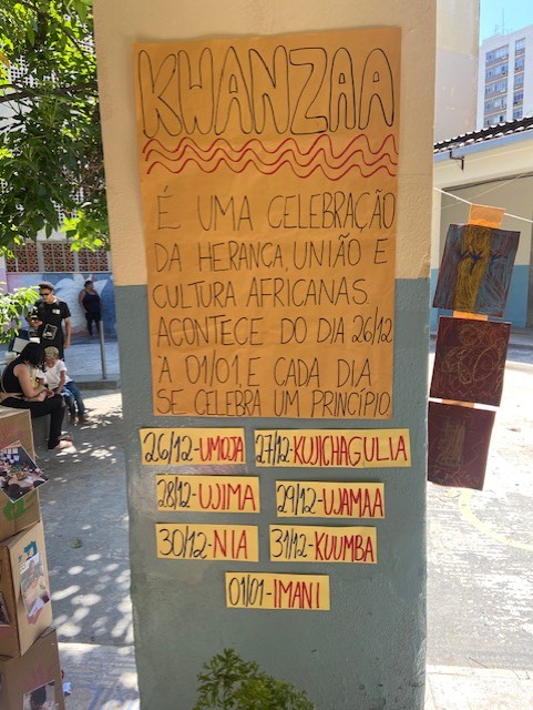 Terceiro Momento: Vamos estruturar nosso kwanzaa? De maneira adaptada, confeccionamos painéis, realizamos desenhos de observação de uma kapulana (tecido africano) original, pintamos uma toalha de algodão cru com os adinkras, realizamos carimbos para estampar tecidos a partir da prática (adaptada com isopor) da xilogravura, montamos presentes artísticos para trocar no dia da festa. Aqui, pensamos gênero textuais como cartazes, receitas das comidas consumidas na confraternização, quantidades, sua história, trabalhando bastante a interdisciplinaridade e a participação infantil para inferir suas próprias impressões e narrativas.