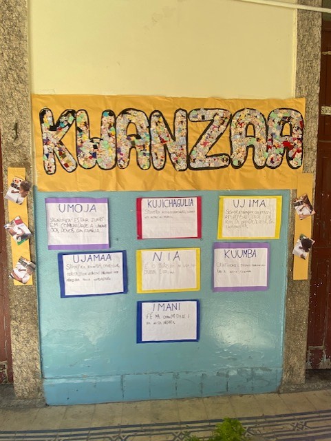 Segundo Momento: Princípios do kwanzaa; Apresentamos vídeos em que os princípios são destrinchados, e depois disso, discutimos com as crianças sobre os mesmos, suas importâncias e o que aquilo significa para cada um. Aproveitamos a oportunidade para discutir qual dos princípios eles se identificaram mais, alinhando-os à convivência escolar, questionando a possibilidade de vivenciá-los com mais afinco na nossa rotina em comunidade. No meio da discussão, surgiu o interesse pelos adinkras, que estão presentes na nossa cultura popular (grades de casas antigas, por exemplo), e como também dialogam com os princípios do Kwanzaa. Aqui, atividades interdisciplinares foram aplicadas, com foco em alfabetização, pensamento matemático, e o entrelace histórico geográfico. Por exemplo; uso de mapas, caça-palavras, jogo da forca, quantidades, unidades de medida, figuras geométricas (adinkras), contação de história, recontos, ditados, confecção de carimbos.