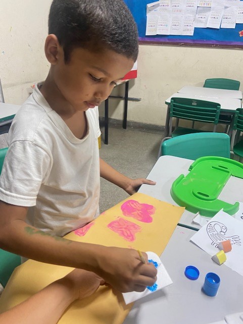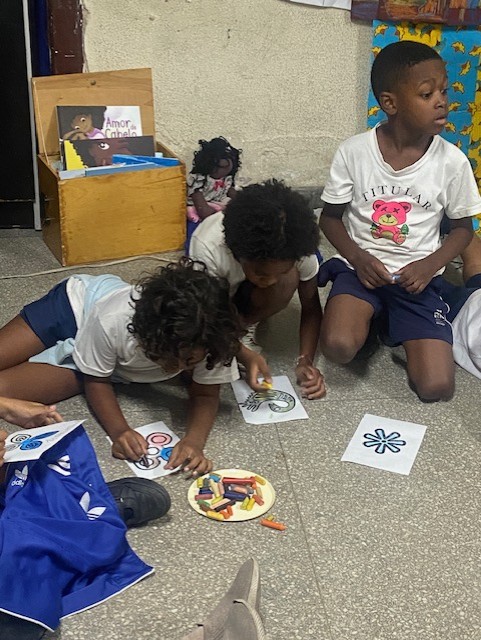 Quarto Momento: Vamos celebrar! É dia de festa, com direito a angu, quiabo, frutas e muita comida típica da nossa afrodiáspora, além de danças, músicas e contação de histórias, é claro. E os nossos presentes foram trocados com muito carinho: Enfeites autorais, carimbos feitos à mão e com muita dedicação pelas nossas crianças, com mediação das professoras, de forma a concluir o projeto.