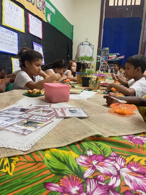 Crianças degustando o menu da nossa celebração: angu com quiabo ao molho de tomate, farorinha de quiabo, frutas e sucos naturais.
