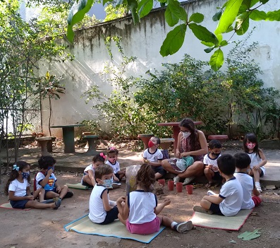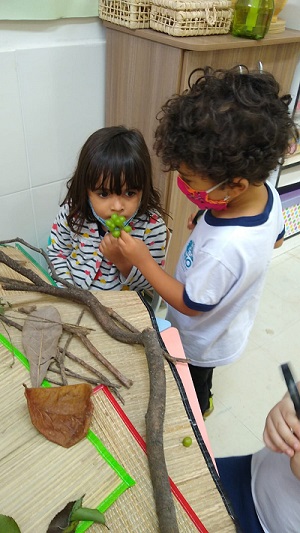 O trabalho se desenvolve assim: as crianças, levadas pela professora, observam árvores, formigas, flores e sementes no pátio da escola. “Elas catam elementos da natureza e trazem para mim. Um me diz ‘a folha parece um tubarão’. Outra criança fala ‘esse coco é cabeludo’. A partir da fala das crianças, sentadas, montamos uma poesia e fazemos uma música com todos esses elementos vivenciados”. Todas essas experiências são inspiradas na cultura dos povos indígenas e transmitem para as crianças valores importantes. A professora também mostra fotografias de diferentes etnias nas conversas com as crianças.