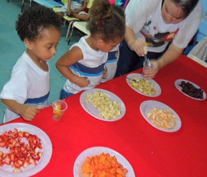 “Já no período de acolhimento, a riqueza de cores, sabores e gostos dos alimentos diferenciados se caracterizava como uma grande novidade”, conta a diretora Mabel Moore. “Quando trabalhamos o Projeto Identidade, no primeiro bimestre, registramos as preferências das crianças, apresentando frutas, legumes e verduras.” A partir do segundo bimestre, o programa agregou literatura infantil. A Cesta da Dona Maricota, de Tatiana Belinky, e O Sanduíche da Maricota, de Avelino Guedes, foram alguns dos materiais utilizados.