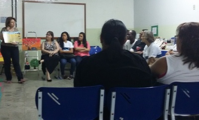 Em uma das mais recentes atividades, Teresa Vitória convidou a também professora de Sala de Leitura, Tânia Regina Almeida, do GEO Juan Antonio Samaranch, em Santa Teresa, para trabalhar com os jovens e adultos da turma de alfabetização o livro Obax (texto e ilustrações de André Neves). A educadora havia utilizado a mesma história na atividade com o 6º ano do GEO e levou as ilustrações feitas pelas crianças para que os estudantes da Orsina fizessem as intervenções que quisessem a fim de concluir os desenhos a quatro mãos.
