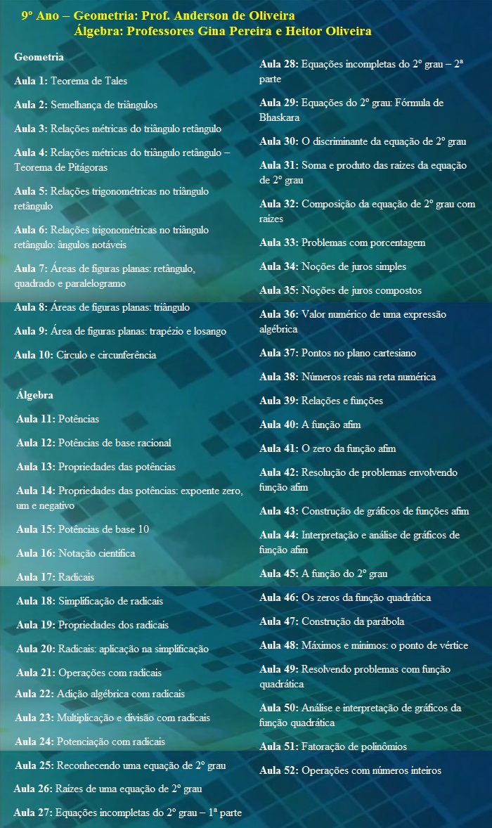 As videoaulas disponíveis são comandadas pelos professores Heitor Oliveira (6º e 9º ano), das E.M. Estácio de Sá; Marcelo Salvador (7º ano), da E.M. Pereira Passos; Clayton Botas (8º ano), do Ginásio Carioca Rivadavia Corrêa; Anderson de Oliveira (9º ano), da E.M. Mozart Lago; e Gina Pereira (9º ano), do Ginásio Carioca Governador Carlos Lacerda.