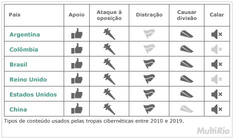 Na pesquisa de Oxford há uma escala para mostrar a capacidade das tropas cibernéticas. A escala vai de 1 (mínimo de capacidade) a 4 (máximo de capacidade). O nível 1 é formado por equipes recentes ou que trabalham de forma intermitente. Caso, por exemplo, da Argentina, na América Latina. O segundo nível engloba equipes pequenas, ativas apenas próximo às eleições, como a Colômbia, por exemplo.