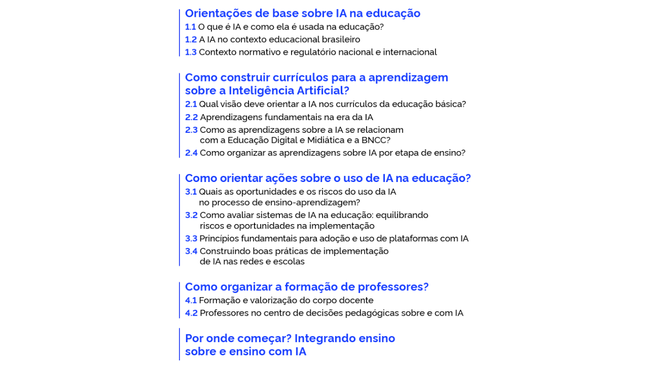 Organizado em cinco capítulos, que orientam redes e escolas desde os fundamentos até a implementação, o documento fomenta o ensino sobre IA e o ensino com IA. No material, são abordados os seguintes temas:
